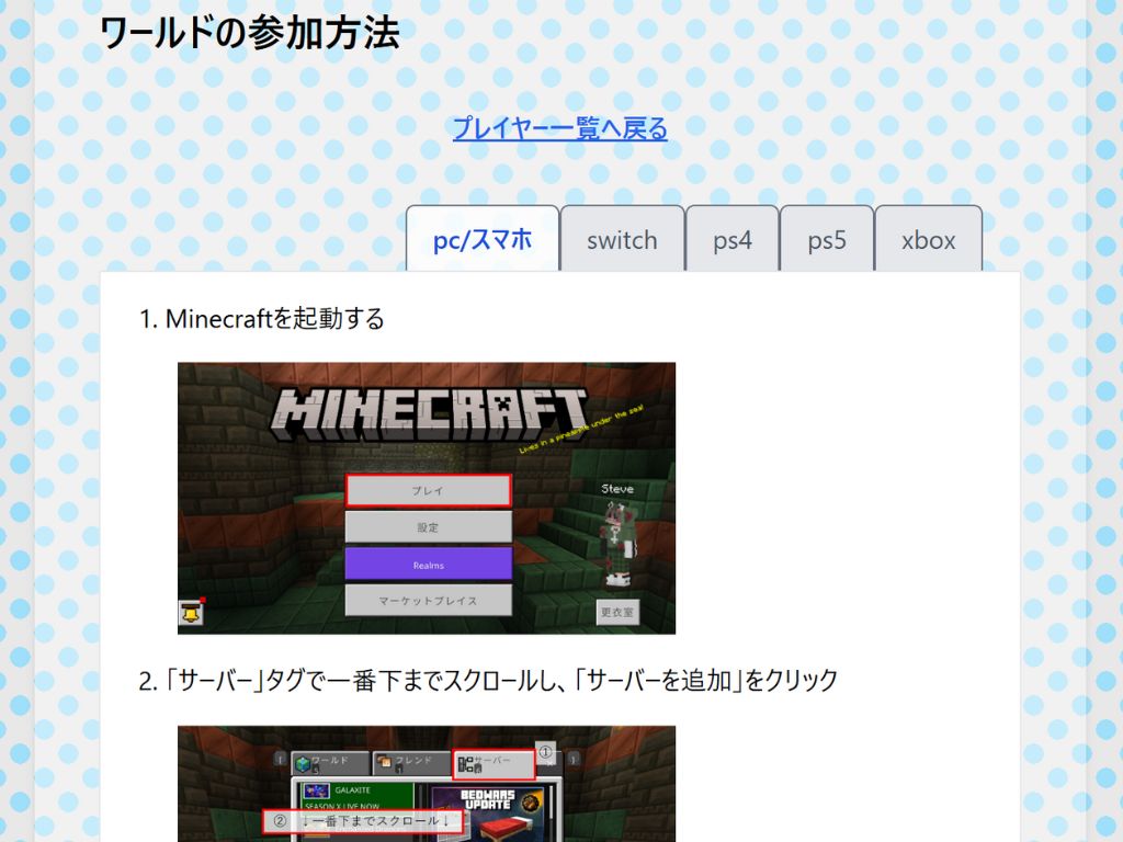 ゲーム機やPCからほわくろサーバーに参加する方法を画像付きで説明します。